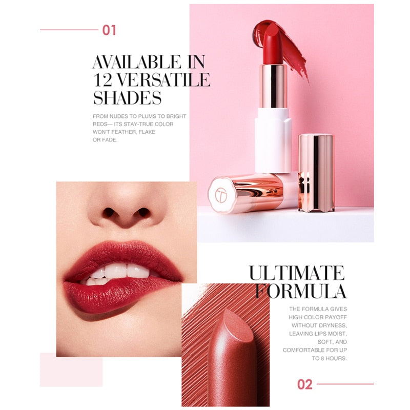Disponível em 12 tonalidades versáteis - de nudes a ameixas e vermelhos brilhantes - batom com longa duração.