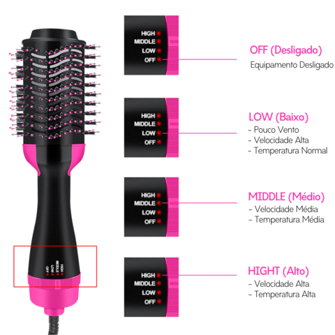 - Seca: selecione dentre as 3 temperaturas para secar os fios com agilidade